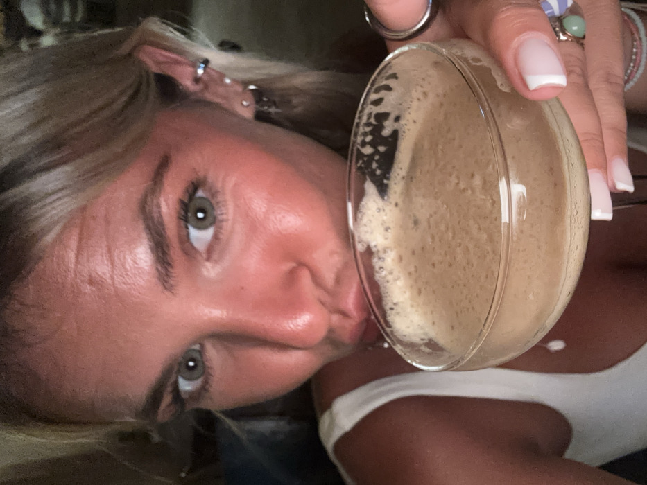 A female individual is depicted in a close-up, selfie-style photograph taken in Uluwatu, Indonesia. She has blonde hair, light-colored eyes, and a tanned complexion with facial redness, possibly from sun exposure. Her lips are pursed, and she looks directly into the camera. She wears a white tank top, multiple ear piercings, a silver-toned necklace, and on her right hand, several rings including a plain band and two decorative rings, along with multiple beaded bracelets on her wrist. Her fingernails are styled with a French manicure. She holds a clear glass containing a brown, frothy beverage, consistent with a coffee-based drink or smoothie. A single drip of liquid is visible on the exterior of the glass. The immediate background is dark and out of focus, providing no discernable environmental details beyond the direct illumination of the subject and the drink.