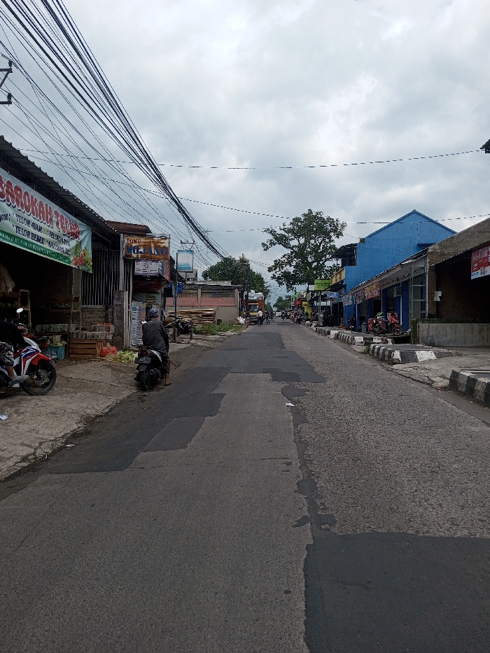 The image displays a straight asphalt road extending into the distance under an overcast sky, located in the city of Khajuripada, India. The road surface exhibits multiple patches and repairs. On the left side of the road, a concrete sidewalk is present, adjacent to a storefront with a light-colored awning. A banner affixed to this storefront displays text, including "BAROKAH TELUR," "TELOR AYAM," and "TELOR BEBEK," suggesting commercial activity. Below the awning, wooden crates and sacks are visible. A red and white motorcycle is parked on the sidewalk near the storefront. A solitary male figure, dressed in dark clothing, is seated on a white scooter, positioned near the left curb and facing away from the viewer, appearing stationary. Above the left side of the street, a dense array of black electrical or communication cables is visible. On the right side of the road, a concrete curb with alternating black and white stripes delineates the edge of the street. Beyond this, several commercial buildings line the street. A prominent two-story building features a bright blue facade and a gable roof. Multiple motorcycles are parked along the sidewalk in front of these establishments. Further down the street, additional buildings, various vehicles, and a large green-leafed tree are discernible. The distant horizon reveals faint outlines of hills or mountains beneath the uniformly cloudy sky.