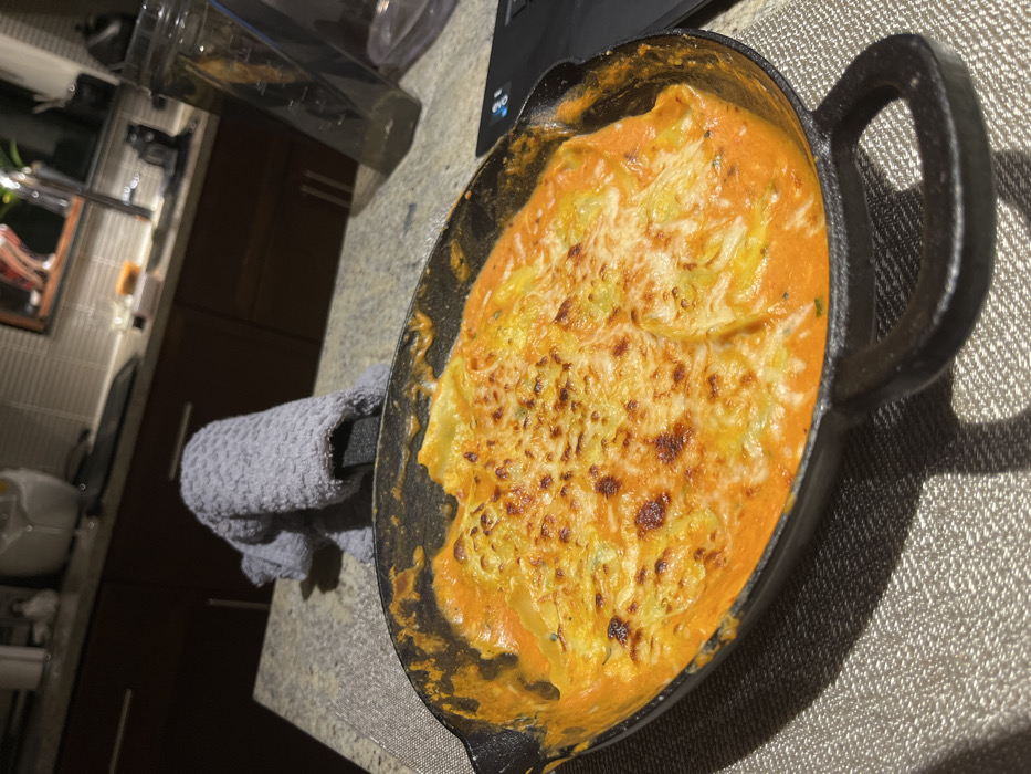 - "The image displays a baked pasta dish in a black, oval cast iron skillet with two handles, positioned on a woven, light brown placemat atop a speckled light-grey kitchen countertop" by FM-WegpJ2, licensed under CC BY 4.0