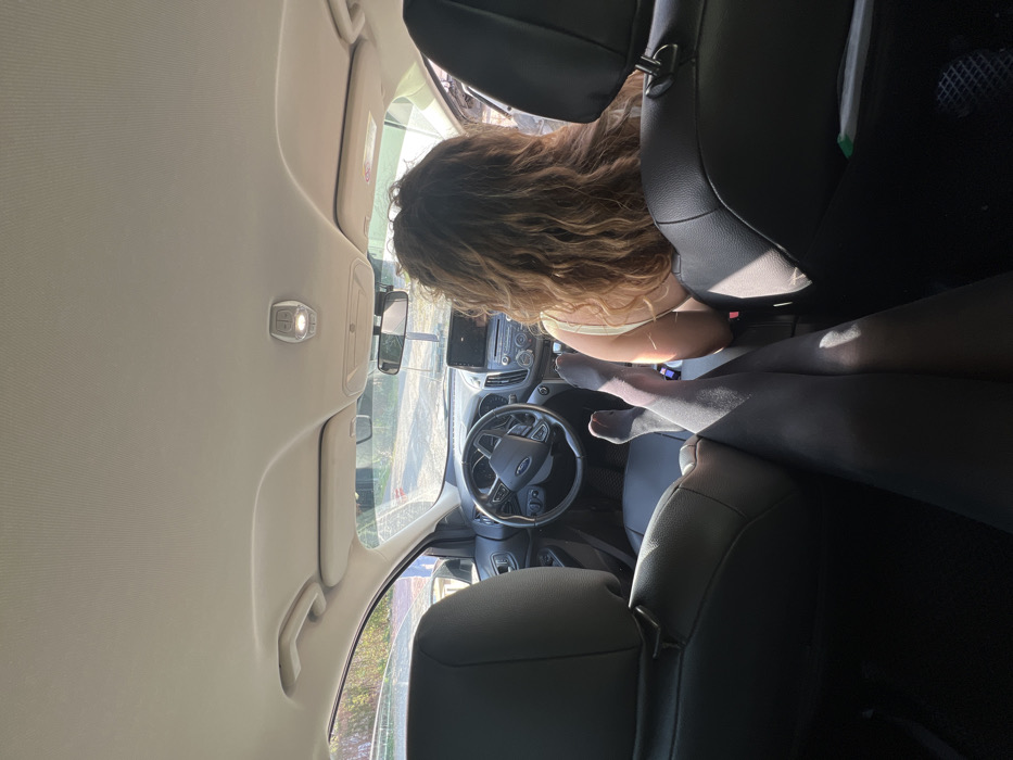 interior of a vehicle, observed from the perspective of a rear passenger in the city of Podgorica, Montenegro. A person with long, wavy, light brown hair is seated in the front passenger seat, facing forward, wearing a light-colored top with a visible shoulder strap. The legs of the individual in the rear seat are extended, crossed at the ankles, and resting against the back of the front passenger seat; they are clad in dark tights or leggings, with bare feet or thin hosiery visible. The vehicle's interior features a dark dashboard, a Ford-branded steering wheel, and a central infotainment screen. Through the windshield, a sunlit outdoor environment is visible, comprising a paved or gravel surface, green vegetation, and a vertical pole-like object. Sunlight casts distinct shadows within the vehicle's cabin, indicating clear weather.