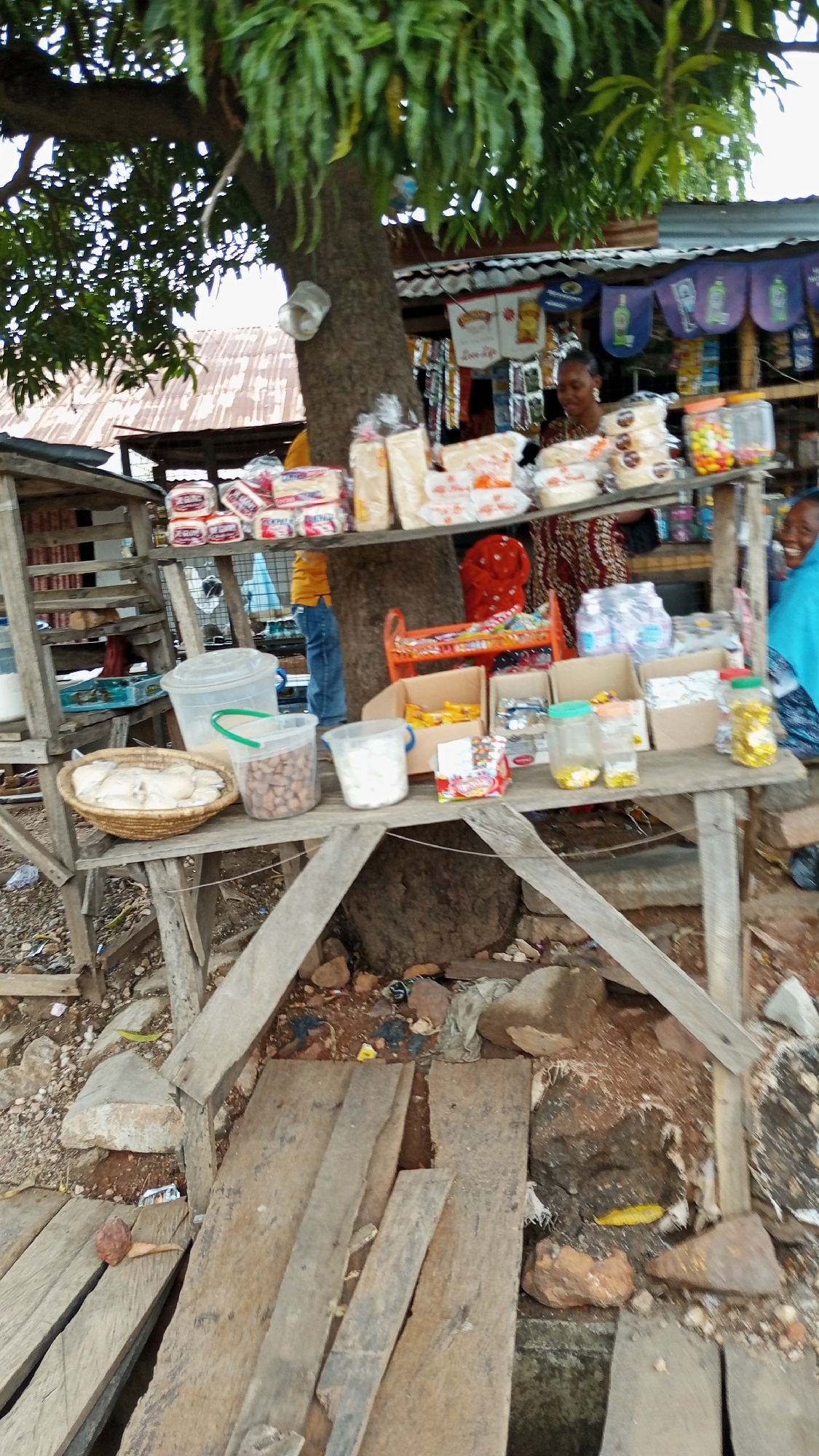 roadside shop in Zango-ndaji, Nigeria. The shop is constructed of rough-hewn wood and consists of a series of shelves stocked with various goods. There are breads, biscuits, cookies, bottled goods, water bottles, and other sundries on display. A woman in a patterned dress and head wrap stands behind the shelves, seemingly attending to customers. Another woman in a blue head covering is partially visible on the right. The shop is built around a large tree, with its branches providing partial shade. The ground around the shop is dirt and scattered debris. A makeshift wooden walkway is in front of the shop. The overall setting suggests a low-income, informal trading environment in a rural or semi-rural location.