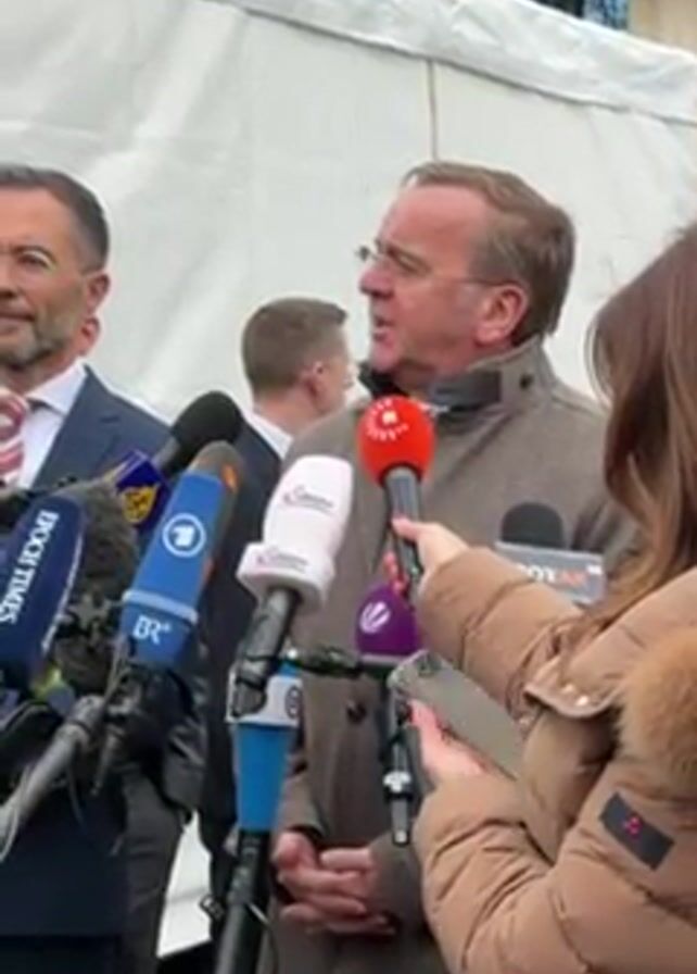 A man in a brown overcoat, glasses, and a red tie is speaking into a cluster of microphones. The microphones are from various news organizations, including "Epoch Times," "ZDF," "BR24," "ServusTV," "Rojak," and a purple microphone with an unrecognizable logo. Several people are visible behind the man, including a man in a blue suit and red tie to the left, a man in glasses and a suit standing in the background, and a woman in a tan puffer jacket holding a phone and standing behind the microphones. The background appears to be outdoors, near a white tent.