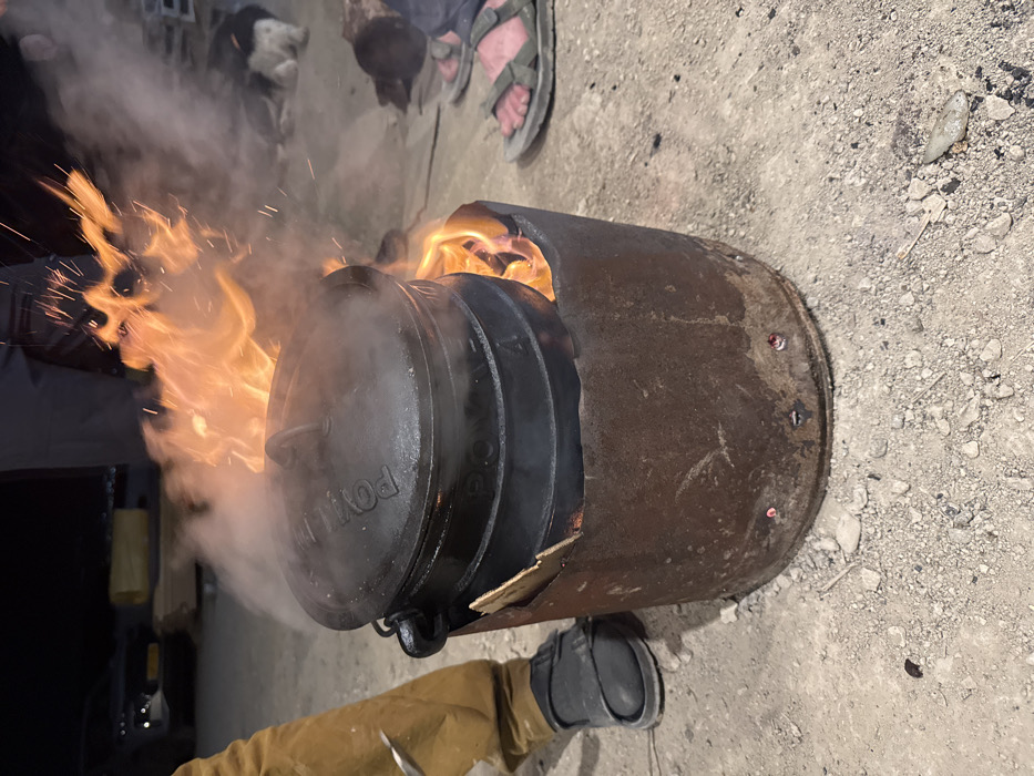 A large, black, cast-iron pot sits inside a rusted metal cylinder with flames engulfing it. Smoke billows from the pot, suggesting something is cooking inside. The cylinder has a cutout to allow access to the pot. The scene appears to be outdoors on a gravelly surface. Parts of people are visible around the pot, including feet wearing sandals and sneakers, and legs in khaki pants.