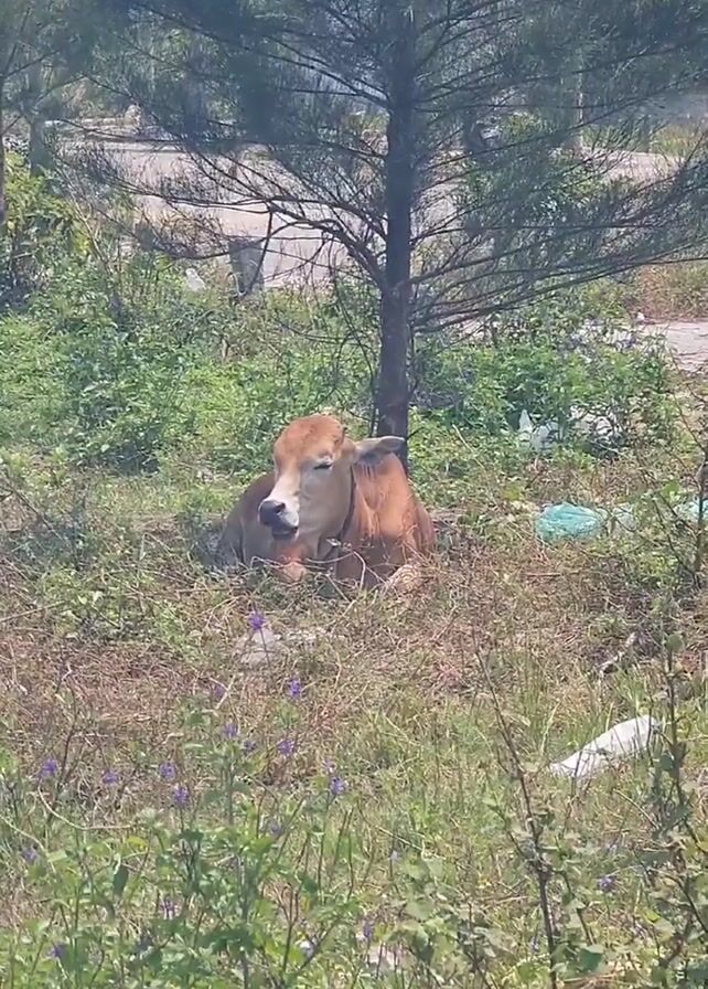 A light brown cow is lying down in an area of overgrown grass and weeds with a few small trees nearby. The cow is facing towards the left of the frame. A collar can be seen around the cow's neck. Some litter, including a green plastic bag and white items, is scattered in the background. A road and some buildings are visible in the far background. The weather appears to be sunny.