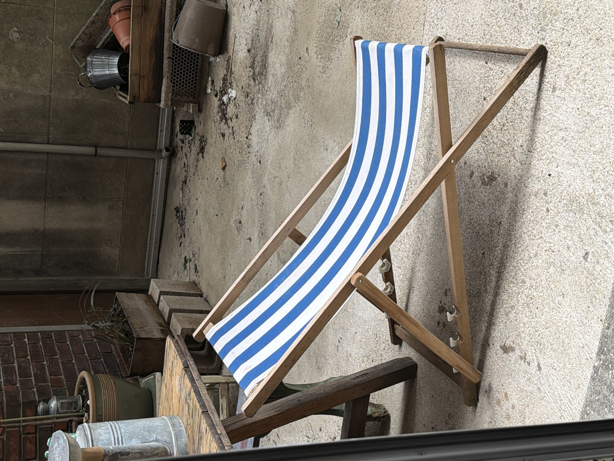 A deckchair with blue and white stripes stands on a textured grey surface. A wooden planter box and various containers are nearby. The scene appears to be outdoors, possibly in a courtyard or backyard. The location is unknown, and it is not possible to determine the city of Aubervilliers, France from this image alone. There are no people in the frame.