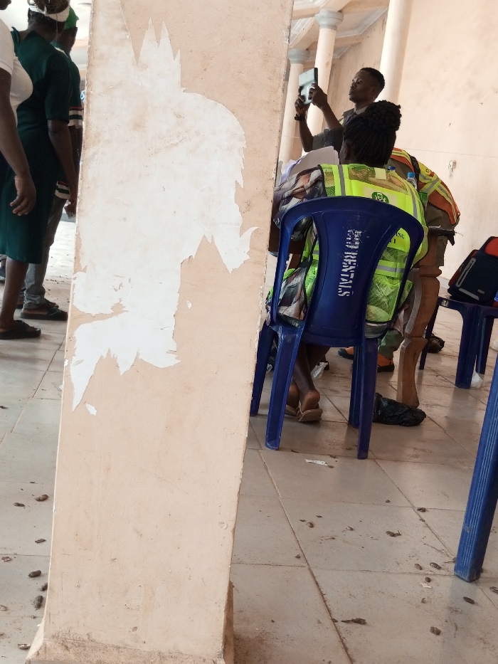 The image captures an indoor or covered outdoor area in Ajalli, Nigeria. In the immediate foreground, a cream-colored vertical structural pillar exhibits extensive peeling paint, revealing lighter patches underneath. To the left of this pillar, multiple individuals are partially visible standing, including one person in a dark green uniform-like garment. To the right of the foreground pillar, a person is seated on a blue plastic chair, facing away from the viewer. This individual wears a neon yellow-green reflective safety vest, and the chair's back displays faded white text, possibly "RENTALS". Their feet, clad in light-colored flip-flops, are visible beneath the chair. Behind the seated person, another individual, also wearing a reflective vest, is partially visible. Further to the right and in the background, a person with short, dark hair stands, holding a black smartphone horizontally, seemingly operating it for recording or photography. The floor consists of light-colored square tiles, which are marked by scattered dark debris and small paper fragments. In the background, decorative white columns with capitals are visible, suggesting the architecture of a public or semi-public building. A dark bag or object rests on the tiled floor near the chairs.
