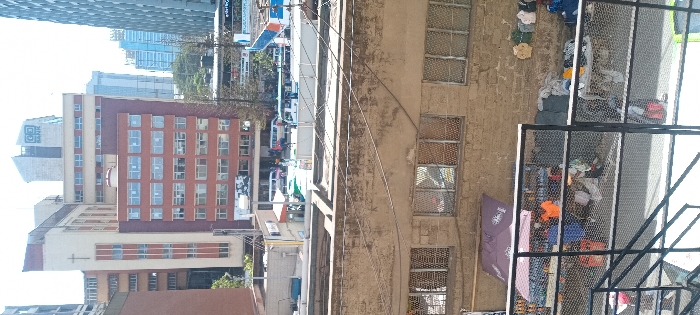 The image displays an elevated daytime view of a dense urban environment in Nairobi, Kenya, specifically within the vicinity of PCEA St. Andrew's Church at the junction of Nyerere Road and University Way, with the Co-operative Bank skyscraper discernible in the background. In the immediate foreground, a black metal mesh fence with diagonal supports partially obstructs the lower portion of the scene. Below this fence, a street-level market operates. To the left, a purple canopy provides shade over a stall displaying various items, including an orange t-shirt and blue garments. To the right, bundles of clothes are arranged on the ground and on simple displays against a light-brown textured wall. A person wearing a blue shirt is seated among the merchandise on the right. The midground features a weathered, multi-story building constructed from light-brown masonry blocks, characterized by numerous windows secured with metal grates. Above its roof, multiple utility cables crisscross horizontally. Beyond this building, a thoroughfare or intersection is visible, populated by several white public service minibuses (matatus) and other vehicles, including a green car. Pedestrians are observable on the sidewalks. The background is dominated by an urban skyline under a bright, clear sky. A prominent multi-story building, identified as part of the PCEA St. Andrew's Church complex, stands out with its reddish-brown and cream facade, featuring a large white cross emblem on its upper section. Adjacent to it is another multi-story reddish-brown building with numerous rectangular windows. Further in the distance, a tall, modern skyscraper prominently displays the "CO-OP BANK" logo at its peak. Additional high-rise buildings with reflective glass facades contribute to the distant urban panorama.