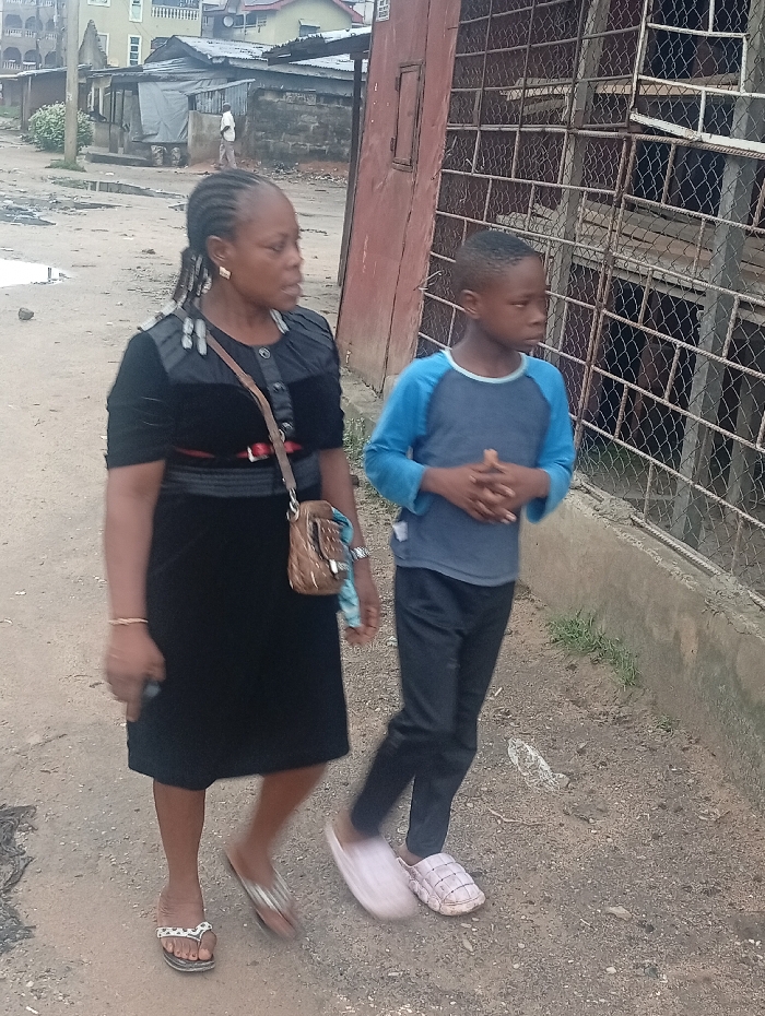 A woman and a boy walk along a dirt road. The woman wears a black dress, sandals, and a crossbody bag. The boy is dressed in a blue long-sleeved shirt, dark pants, and white slippers. They are walking next to a building with a metal security grille. In the background, older buildings and utility poles are visible, suggesting an urban or suburban area.