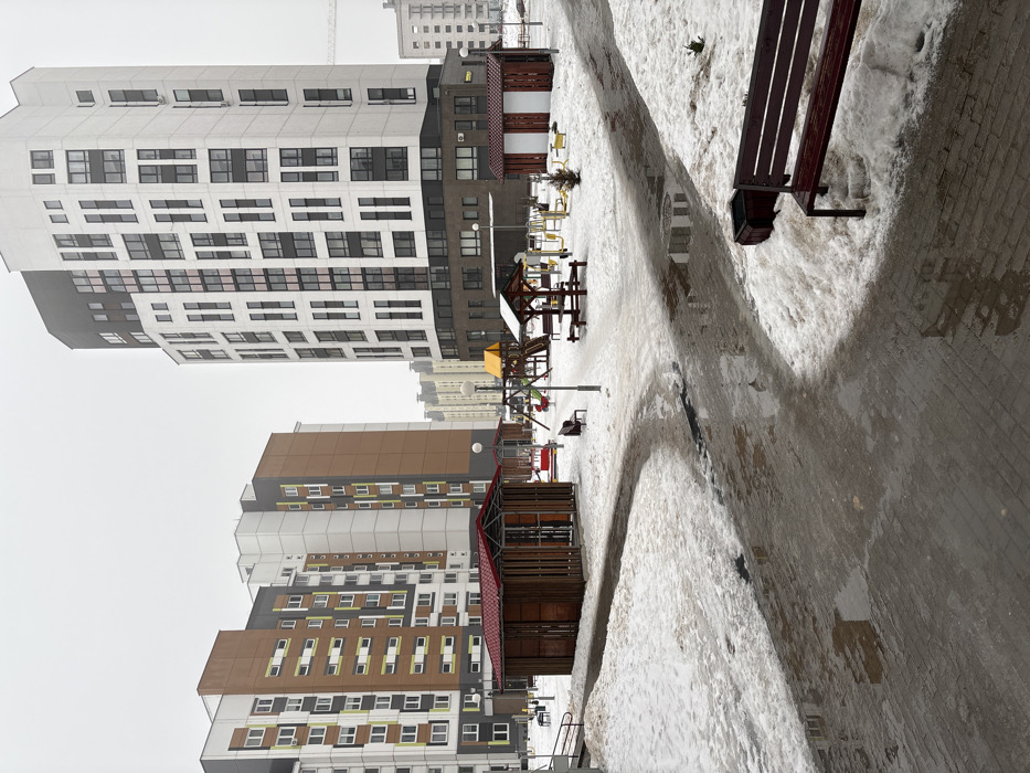 A playground with wooden structures stands between modern apartment buildings on a cold, cloudy day. Patches of snow and wet spots cover the ground and walkways, indicating melting. A brown park bench sits adjacent to a brick path. The high-rise buildings feature a mix of white, grey, and brown panels. The scene appears to be an urban residential area with communal outdoor space during a transitional season.