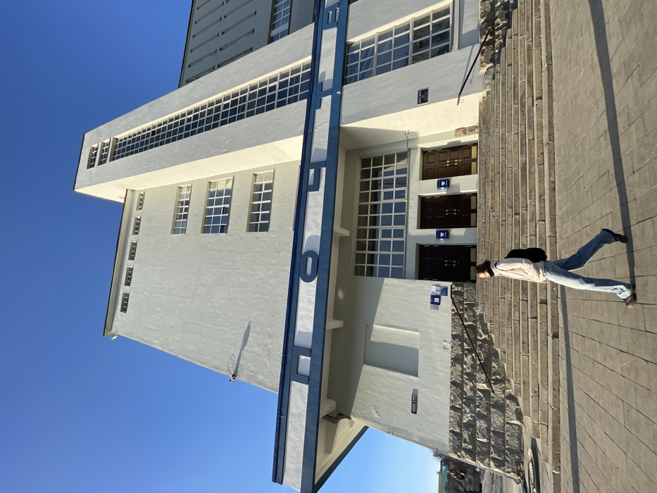 The image depicts a grand architectural building in Yekaterinburg, Russia, identified as the Iset Hotel (Hotel "Iset") located at Lenina Avenue, 69, on a clear, bright day. The building, a prime example of Constructivist architecture, features a prominent light grey/off-white facade with a wide, projecting canopy adorned with blue trim and the Cyrillic inscription "ОТЕЛЬ" (HOTEL). A towering vertical section on the right side of the main entrance is characterized by a long, narrow expanse of multi-pane windows. Other sections of the building feature rows of horizontally oriented, multi-pane rectangular windows. The base of the building is constructed from large, rough-hewn stone blocks. A wide, multi-tiered staircase of grey stone leads up to three sets of double brown entrance doors, each flanked by blue signs with white emblems. A security camera is mounted on the upper left portion of the building's facade. In the foreground, a single individual walks from left to right on a paved sidewalk of grey rectangular blocks. The person wears a light-colored puffer jacket, blue jeans, dark shoes, and a black backpack, with a dark face covering obscuring part of their face. Long shadows are cast to the right across the sidewalk and lower steps, indicating bright sunlight.