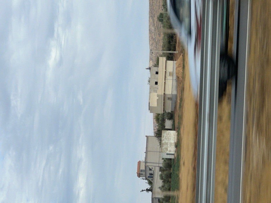 This image, captured in Laqsir, Morocco, presents a roadside view under a partly cloudy sky. In the foreground, a silver-colored vehicle, possibly a truck or SUV, with red and white graphic elements, is in motion from right to left, partially obscured by a two-bar metal guardrail. The road surface, a dark asphalt, is visible beneath the guardrail, transitioning to a strip of dry, yellowish-brown earth. The midground reveals an arid landscape featuring multiple structures and vegetation. To the left, a light-colored building with a distinct reddish-orange tiled roof structure is visible, accompanied by a smaller, white, rectangular auxiliary building. To the right, another building, appearing unfinished or under construction, displays light beige concrete walls with rectangular openings and is fronted by a mound of reddish-brown earth. Scattered throughout the midground are numerous small trees and green vegetation, interspersed within the dry, light brown soil. The background consists of a range of barren, rocky hills under a pale blue sky with scattered white and light grey clouds. No individuals are present in the scene.