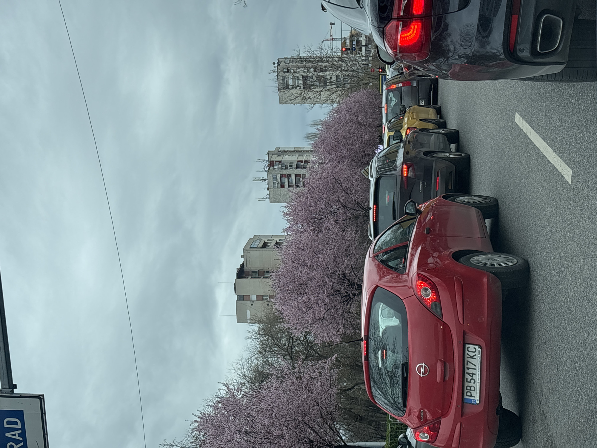 street scene in Plovdiv, Bulgaria, with a line of cars stuck in traffic. The buildings in the background appear to be residential apartments. Flowering trees with pink blossoms line the street. The sky is overcast. A red Opel Corsa is the closest car in the image, with its license plate number PB5417KC visible. Other cars in the traffic line include a dark-colored BMW SUV, a dark gray SUV, and a gold-colored vehicle. The street has a white line marking lanes. A street sign with the word "RAD" is partially visible.
