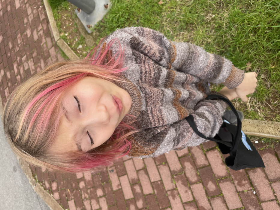 A young girl with pink-streaked blonde hair stands outside with her eyes closed. She wears a brown and gray sweater and carries a black tote bag. She stands on a brick walkway near a grassy area and a metal structure. The photo is taken from a high angle, looking down at the girl.