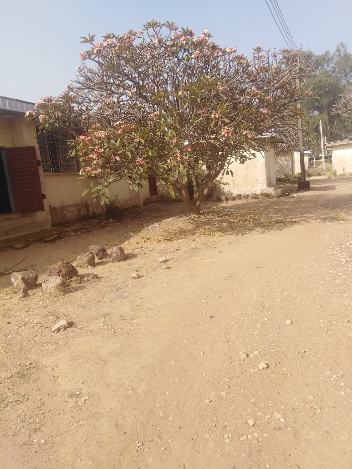 The scene depicts an outdoor residential or semi-rural area in Bisichi, Nigeria, under bright daylight. A large, multi-branched tree, identified as a Plumeria, stands prominently in the center-left, featuring numerous pinkish-red blossoms and sparse green foliage. Its branches extend, casting shadows on the dry, light brown ground composed of earth and scattered small rocks. To the immediate left of the tree, a light-colored, single-story building with a corrugated metal roof is visible. This structure features a window secured with a metal grille and a partially open wooden door with reddish-brown shutters. A line of several dark, irregular rocks rests on the ground directly in front of this building. Further into the background, on the right side of the image, additional similar-looking, light-colored single-story buildings are partially visible, interspersed with sparse vegetation. Overhead utility lines are strung across the upper right portion of the sky, supported by a utility pole partially obscured by the central tree. The sky above is clear and light blue. No individuals, actions, or interactions are observable within the frame.