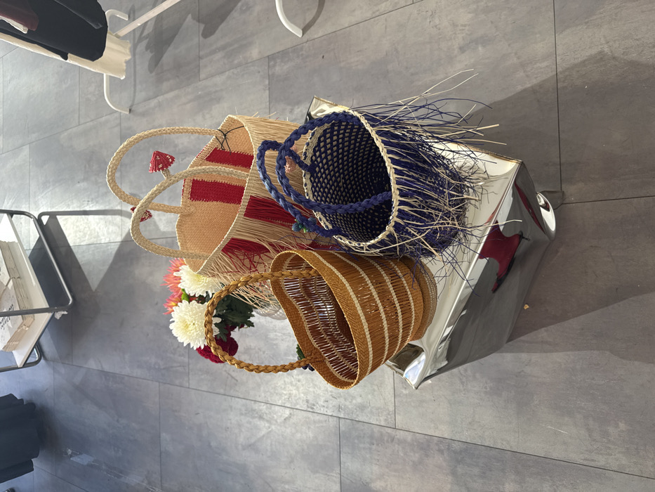 The image displays an indoor retail or gallery environment, the exact location within Milan, Italy, not being discernible. Three distinct woven bags/baskets are arranged on a highly reflective, possibly chrome, display stand. The central rear item is a large, light brown woven tote with vertical red stripes, a fringed lower section, and two braided handles accented with small red details. To its left, a smaller, oval-shaped dark orange basket with horizontal white stripes and a single braided handle contains a small arrangement of white and red flowers. To the right, a dark blue woven basket with two braided handles features a fringed base. The reflective stand casts distinct reflections onto the grey tiled floor. In the blurred background, a white metal shelving unit stocked with books or flat items is visible on the left, and a white metal clothing rack with a dark garment hangs on the right. No individuals are present in the scene.