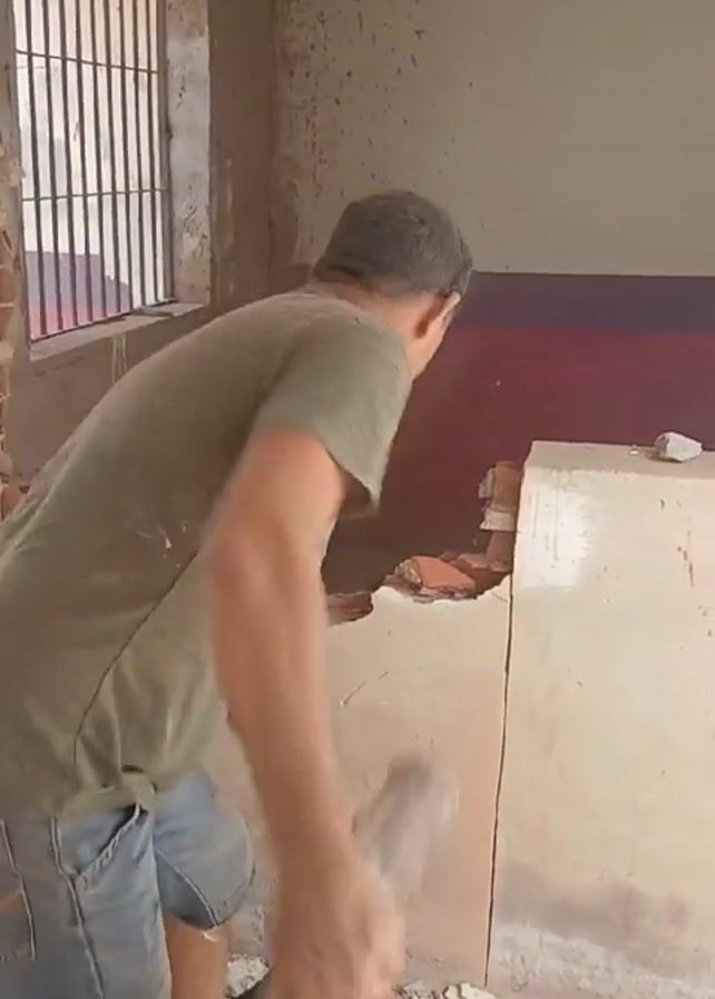 A man is demolishing a wall with a log. He is in a partially demolished room, with exposed brick and concrete. A barred window is visible. The man is wearing a green shirt and jean shorts. He is swinging the log at the wall to break it apart. Dust and small pieces of debris are flying off the wall.