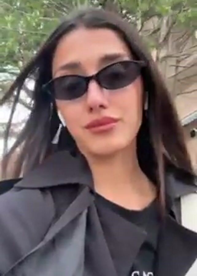 - "A woman with long dark hair, wearing small black sunglasses, a black t-shirt with white lettering, a black trench coat, and white earbuds is walking outside during the day" by FM-fSbZr2, licensed under CC BY 4.0