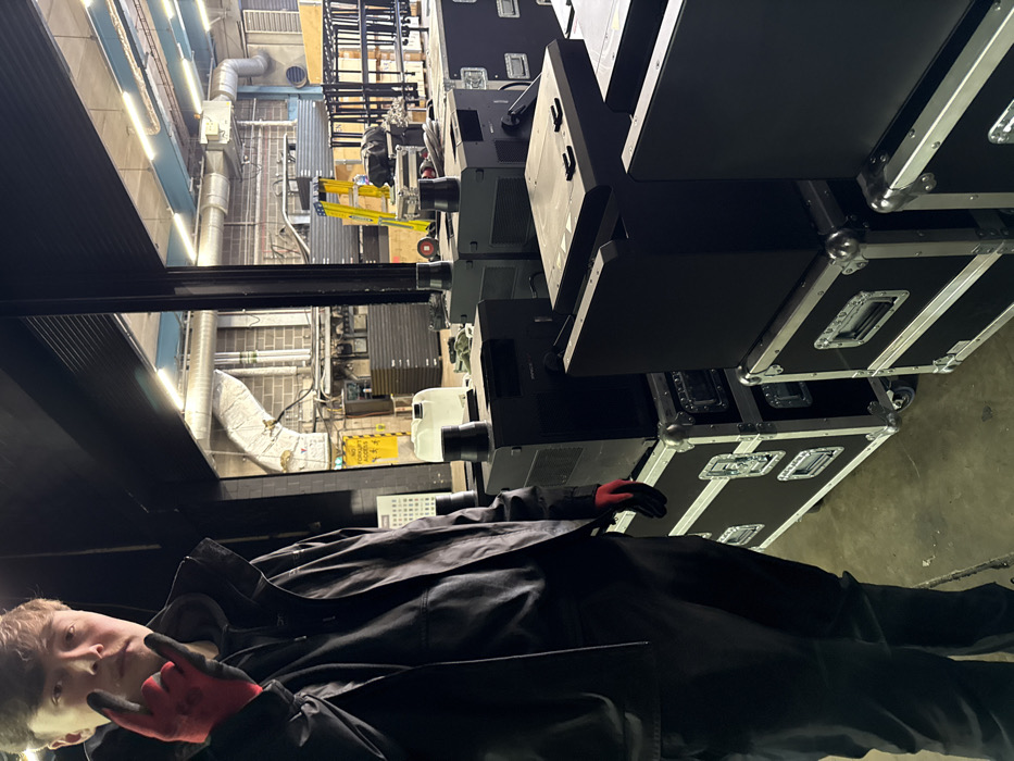 This image depicts an indoor industrial staging or warehouse environment identified as Savage Stage, Unit 1 Lenton Lane Industrial Estate, Lenton Ln, Nottingham NG7 2PR, United Kingdom. A young Caucasian male with light brown hair, wearing a dark hooded jacket, dark shirt, and dark trousers, stands in the left foreground. He wears red work gloves on both hands, with his right hand raised, forming a "rock-and-roll" or "devil horns" gesture. His gaze is directed towards the camera. The foreground and midground feature multiple black flight cases with silver metal hardware (corners, latches, handles), some equipped with wheels. Stacked on these cases are several black electronic devices, including Chauvet Maverick lighting fixtures, identifiable by their branding and characteristic cylindrical tops. A white plastic fluid container rests on one of the lower cases. To the male's left, a white calendar or poster with "SAVAGE" and a ".CO.UK" website URL is partially visible. The background reveals a large industrial space with exposed light-brown brick walls and extensive silver ventilation ducts running along them. A yellow warning sign, partially obscured, reads "NO FORK LIFT ACCESS" or similar text. Stacks of dark, flat objects, possibly stage decks or risers, are against the left wall. Further into the background, a yellow folding ladder, various metal structures (possibly trussing or racking), and additional industrial equipment are visible. The ceiling features horizontal metal beams and multiple fluorescent light fixtures illuminating the area. The floor is a concrete slab. The overall environment suggests an area for event production setup, storage, or preparation.