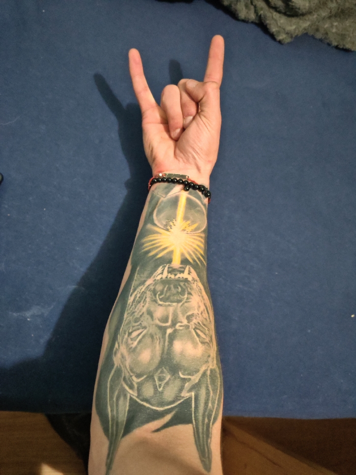A close-up, top-down view of a person's right forearm and hand is depicted, resting on a dark blue, textured surface. The scene is located in Bozhurishte, Bulgaria. The hand performs the "rock on" gesture, with the index and pinky fingers extended vertically, and the middle, ring, and thumb curled inward. Two bracelets are present on the wrist: a red string bracelet with a small metallic rectangular bead, and a black beaded bracelet. The forearm features a large tattoo; near the wrist, a luminous, radiating light source with yellow and white rays is visible. Below this, occupying a significant portion of the forearm, is a grayscale tattoo of a stylized, fanged creature's head, oriented inverted relative to the hand. A shadow cast by the extended fingers is visible on the blue surface to the left of the hand. A dark grey, textured object is partially visible in the upper left corner of the frame.