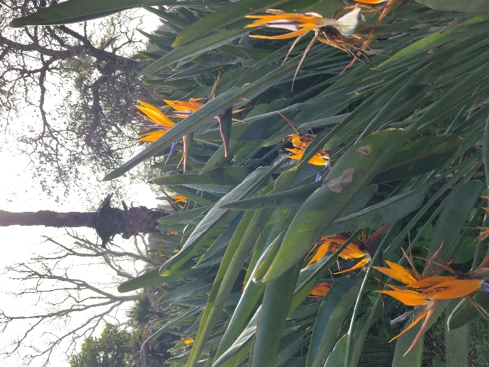 The scene depicts an outdoor botanical garden or cultivated area within Zikhron Yaakov, Israel. The foreground and midground are densely filled with Strelitzia (Bird of Paradise) plants, characterized by numerous large, dark green, lanceolate leaves. Multiple Strelitzia flowers, featuring prominent orange sepals and blue petals, are observed throughout the foliage, in various stages of bloom and visibility. The perspective is a low-angle shot, looking upwards through the plant growth. In the background, a dark, vertical palm tree trunk is centrally positioned, silhouetted against a bright, overcast sky. To the left and right of the palm, leafless deciduous trees with intricate branch patterns are also visible as silhouettes against the illuminated sky. Natural daylight provides overhead illumination, highlighting the foreground plants and backlighting the background trees. No human subjects or discernible man-made structures are present within the frame.