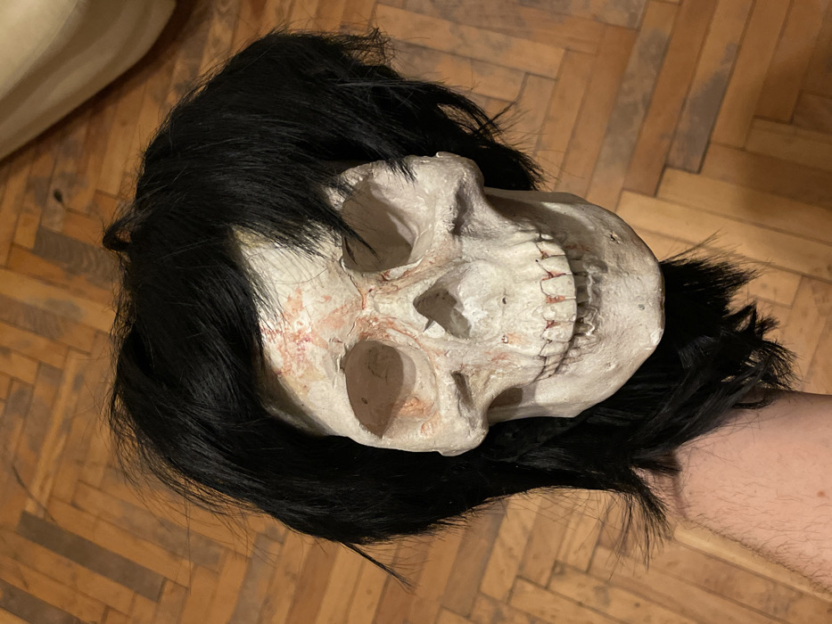 A forensic examination of the image reveals an artificial human skull, beige with reddish-brown discoloration, fitted with a disheveled short black wig