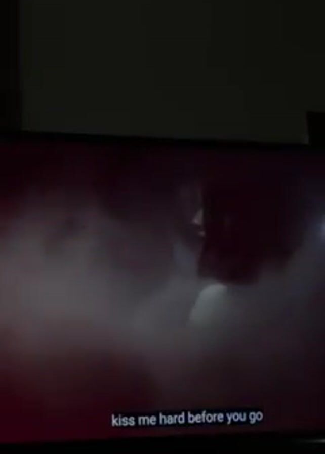 television screen displaying a music video. The visual is dark and moody, with a red-toned background and a cloud of white smoke or fog. A woman with dark, wavy hair and pale skin is visible through the haze, looking at the viewer. Subtitles at the bottom of the screen read "kiss me hard before you go" and "summertime sadness". The room around the television is dark.