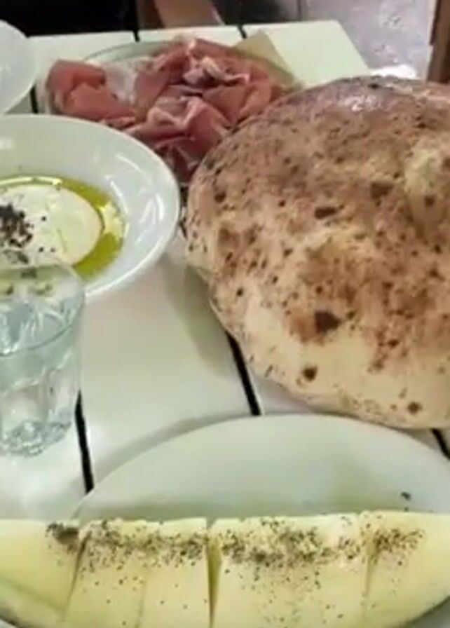 The scene is a table set with a variety of foods, including burrata with olive oil and black pepper, prosciutto, a large round loaf of bread, and a slice of melon sprinkled with what appears to be pepper. People are seated around the table, their arms and torsos visible. A partially-visible chair is in the background. The table has a white, slatted surface. The setting seems to be an outdoor dining area, judging by the daylight and glimpses of people walking by.