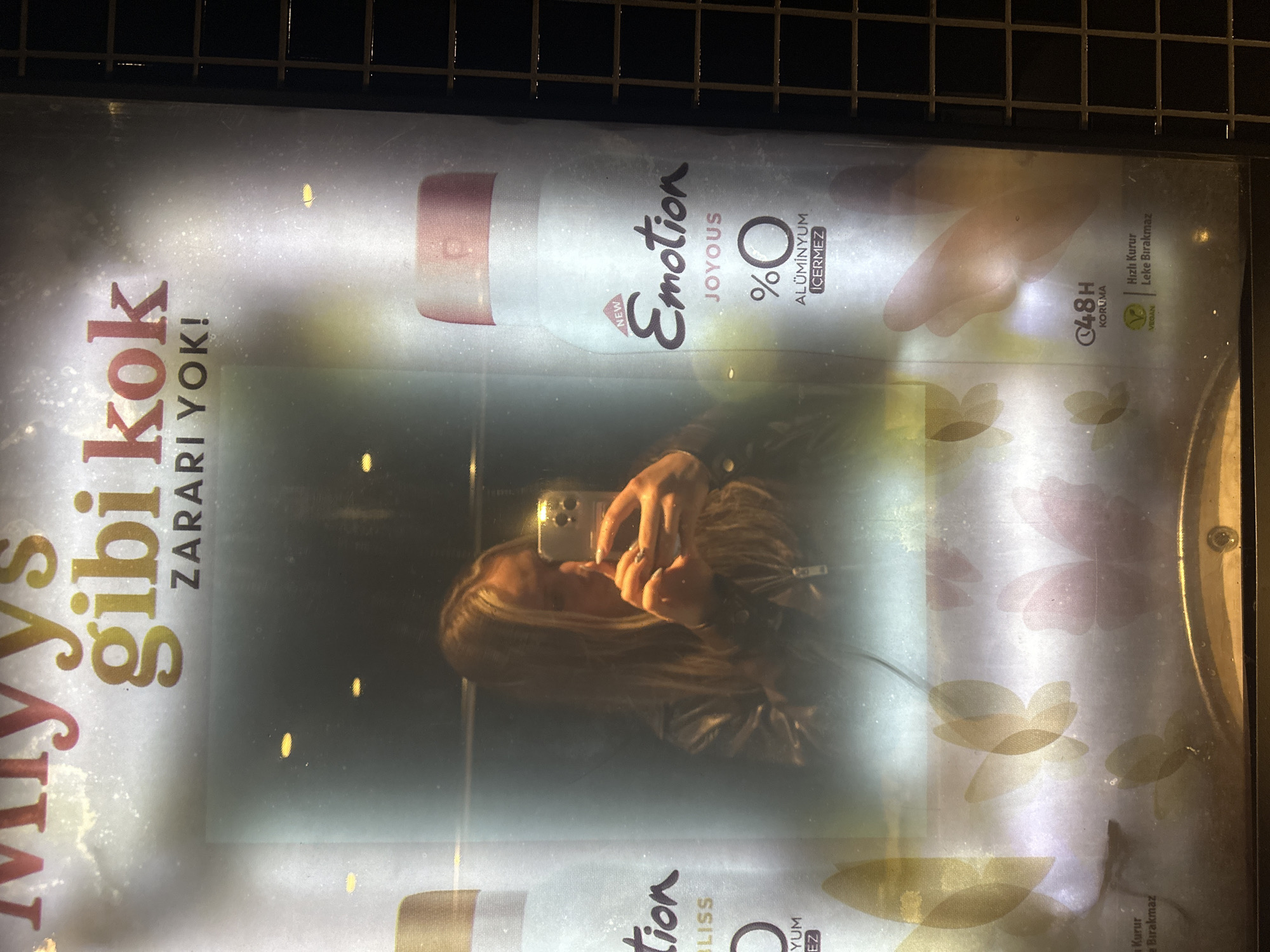 The image is a reflection in a display case advertising "Emotion Joyous" deodorant