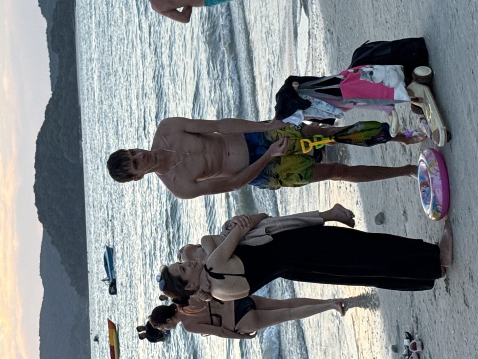 The scene depicts a beach at Cenang Beach, Malaysia, during late afternoon or early evening. In the foreground, a woman in a long black dress holds a child wrapped in a light-colored cloth. Sunglasses rest on her head, and she looks to her right. The child looks upward. To their right, a bare-chested man wearing patterned swim shorts and a cross necklace stands, holding a yellow sand shovel and a green mesh bag. His gaze is also directed slightly to his right. On the sand near their feet, a pink inflatable ring, a wooden push toy with wheels, and a black bag with various items of clothing draped over it, including a pink tote bag featuring a cat design, are present. In the midground, a woman in a black bikini stands partially submerged in the water to the left of the main group. Other indistinct figures are visible further out in the water. Several shoes or sandals are scattered on the wet sand to the left. The water shows gentle waves, and in the distance, forested hills or islands rise against a twilight sky with a subtle orange hue near the horizon. Two boats, one yellow and one blue, are visible on the water further offshore.