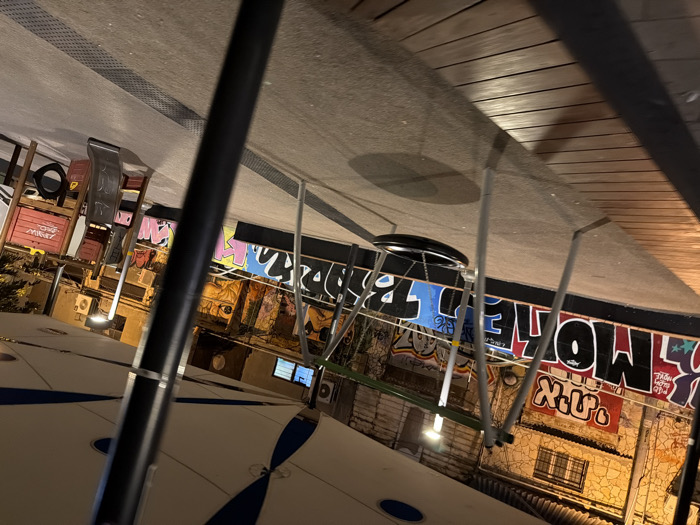 An illuminated urban playground is depicted at night, likely situated within Tel Aviv, Israel, identifiable by visible Hebrew graffiti. The scene is devoid of people. In the foreground, a dark wooden slatted pathway or deck occupies the left side, extending into the mid-ground. The primary playground area features a dark gray paved surface. Centrally positioned is a metallic swing set with silver supports, holding a single black tire swing. To the right, a multi-component playground structure is visible, consisting of a small gray slide, wooden steps, and a red wooden platform or fort. A vertical dark pole, likely part of the canopy support, is prominently out of focus in the extreme right foreground. The background consists of a long wall or fence heavily adorned with colorful graffiti tags, including prominent black block letters partially spelling words like "MOHED" and "BRAK", along with the Hebrew word 'איתי'. Behind this graffiti-covered barrier, older urban buildings with textured facades, windows, and mounted air conditioning units are illuminated by artificial light sources. Overhead, a white fabric canopy with blue circular accents is visible, providing partial cover to the playground area. Multiple artificial lights cast distinct shadows from the playground equipment onto the ground.