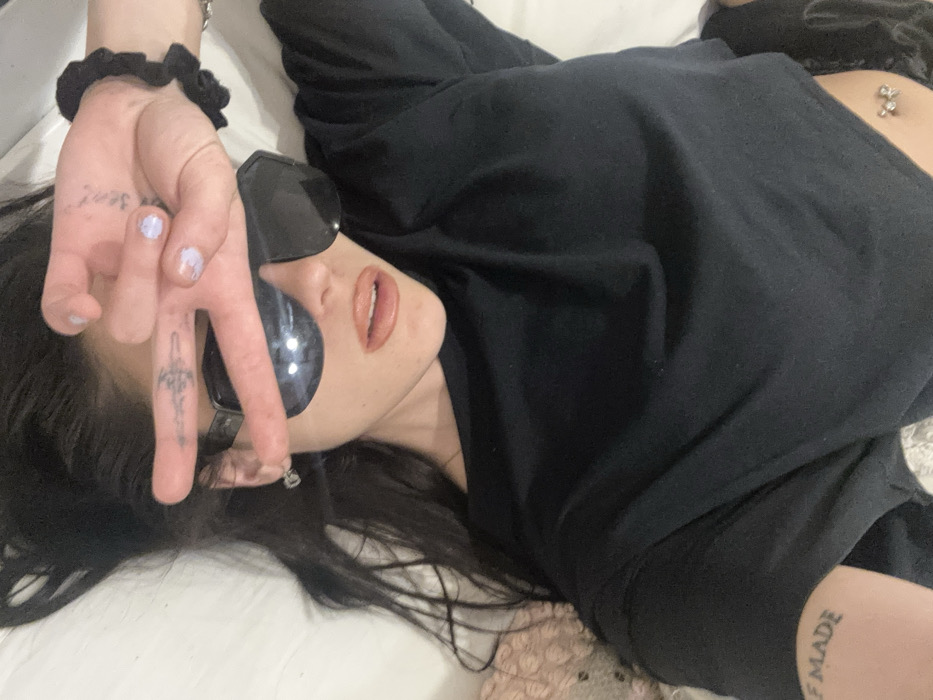 A young adult individual is depicted in a close-up, high-angle shot, lying supine on a light-colored surface, likely bedding. The subject has long, dark hair spread out around their head. They are wearing large, dark, reflective sunglasses that obscure the eyes and upper nose. Their lips are coated with a glossy, light brown or nude lipstick. The subject's left hand is raised, forming a "peace sign" gesture with the index and middle fingers, partially covering the sunglasses. A small, dark tattoo is visible on the ring finger of the left hand, and the fingernails are painted with a light, chipped polish. A black scrunchie is worn on the subject's right wrist. The individual wears a loose-fitting, dark (likely black) short-sleeved or long-sleeved top, exposing a portion of the lower abdomen where a sparkling belly button piercing, possibly shaped like a bow or flower, is visible. A partial tattoo displaying the text 'F MADE' is visible on the inner right forearm. A small earring is present in the subject's left earlobe. The immediate environment consists primarily of a white or off-white sheet or blanket, with a textured, light brown or beige fabric object partially visible near the upper left of the frame. The precise location within the city of Buenos Aires, Argentina, cannot be determined from the provided visual information, as the scene appears to be an indoor setting with no identifiable external landmarks.