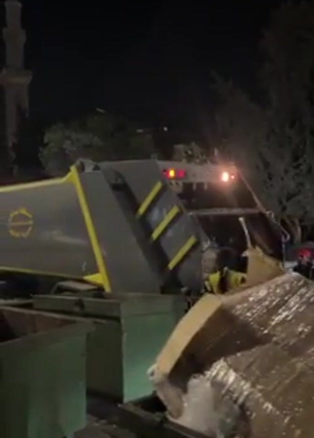 At night, a large, gray and yellow garbage truck is situated in a public space. Two workers are present, wearing high-visibility yellow safety vests and working around a large dumpster. The dumpster is partially full of cardboard boxes wrapped in plastic. The garbage truck appears to be in the process of collecting the waste. In the background, a tall building with a spire can be seen, along with trees silhouetted against the night sky. An emergency vehicle siren wails in the background.