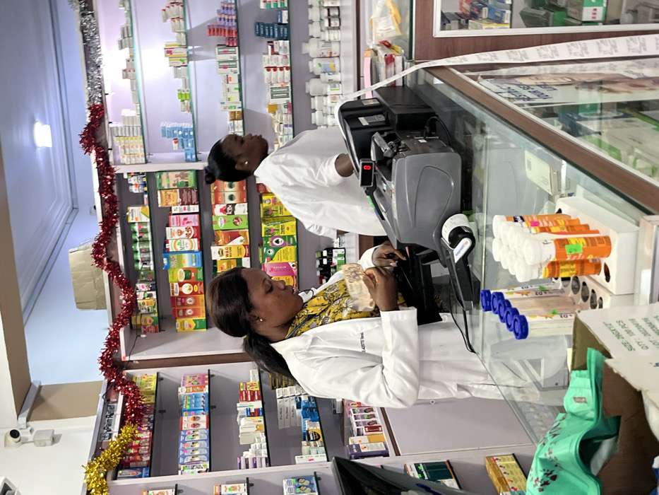 Two women in white lab coats stand behind a glass counter at a pharmacy