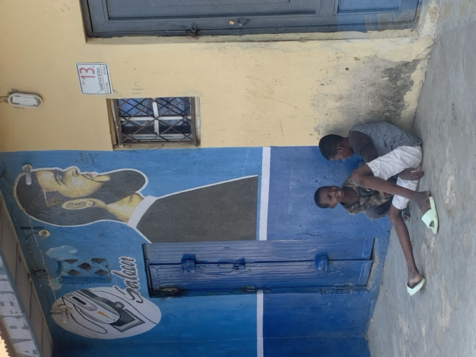 The scene depicts an outdoor street view in Hotoro South, Kano, Nigeria, featuring two male children in front of a building. The building's left section is painted bright blue with a white horizontal stripe, adorned with a large mural of a bearded man's profile and a circular "Saloon" logo featuring a barber's clipper. A blue double-leaf wooden door, secured with visible latches, is centered within the blue wall. The building's right section is a faded yellow-orange wall with significant staining and peeling paint near the base. This section includes a small, grilled window and a white rectangular sign above it, which reads "NO. 13 TSAMIYAR BOKA CITY OF KANO". A white outdoor light fixture is mounted above the sign. To the far right, a gray-blue door is partially visible. Two male children are seated on the light gray concrete ground in the lower right foreground. The child on the left, younger, wears a camouflage long-sleeve shirt and dark trousers, and is crouched facing the other child, smiling towards the viewer. The child on the right, slightly older, wears a gray t-shirt with dark sleeves and white shorts, leaning against the yellow wall with his legs extended. He is wearing light green slide-on slippers. Both children are looking towards each other, engaged in interaction. The lighting indicates daylight conditions.