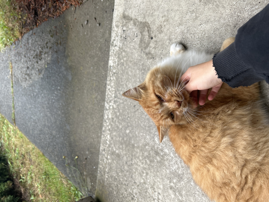 - "An orange cat lies on a concrete surface, appearing to enjoy a gentle scratch under its chin from a person's hand" by FM-p02Wp2, licensed under CC BY 4.0