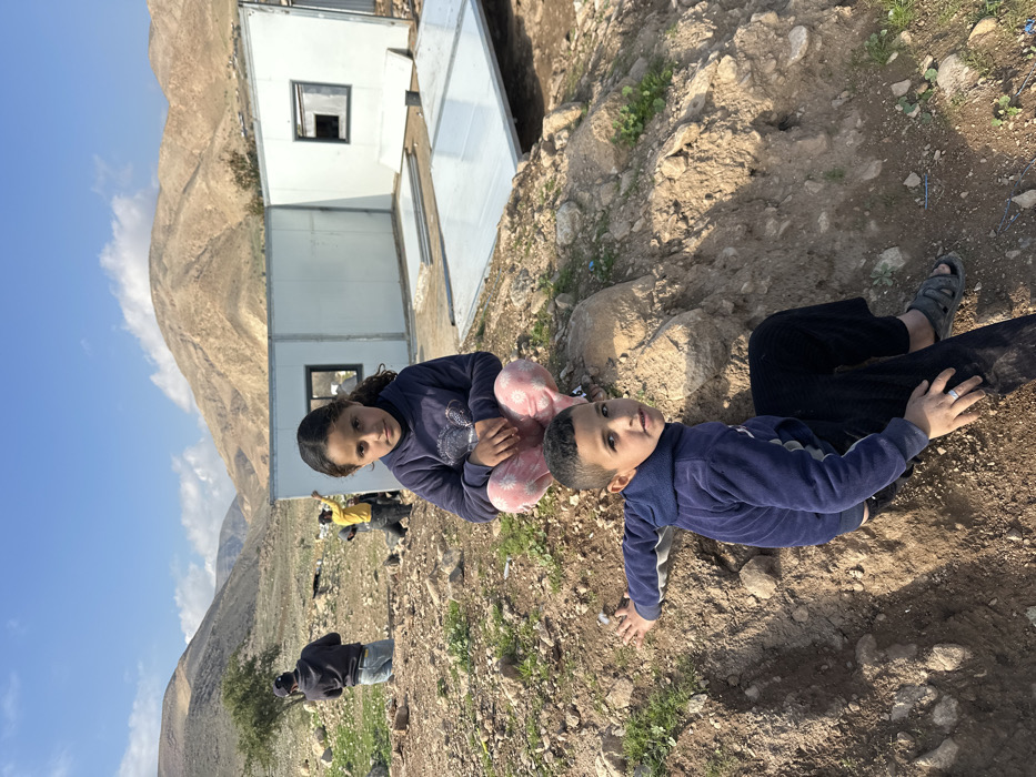 This image depicts an outdoor scene in the city of Ras 'Ein al 'Auja, Palestinian Territory. In the foreground, two children are positioned on an uneven mound of reddish-brown earth mixed with small rocks and sparse green vegetation. An estimated 7-10-year-old girl with dark hair and a neutral expression squats towards the upper left, wearing a dark blue hooded sweatshirt with a white design and light pink pants. Her hands are clasped in front of her. Below her and to the left, an estimated 5-7-year-old boy with dark hair sits on the same mound, wearing a dark blue hooded sweatshirt, dark pants, and dark sandals, looking directly towards the viewer. His right hand is extended, resting on the ground behind him. In the midground, several white, modular prefabricated building sections are visible. Two sections are partially assembled into an L-shape, forming a corner structure, with one section featuring a dark-framed window opening. Additional flat white panels, likely wall or roof components, lie on the ground nearby, suggesting ongoing construction or deconstruction. Three adult males are observable in the midground; one man in a dark top and light pants is partially obscured by a small tree, while two other men, one wearing a yellow top, are near the modular structures, appearing to be engaged in activities related to the buildings. The background consists of rolling, arid hills and mountains, predominantly light brown with patches of green, stretching under a clear to partly cloudy blue sky. A small, gnarled tree stands on a rise in the mid-left.