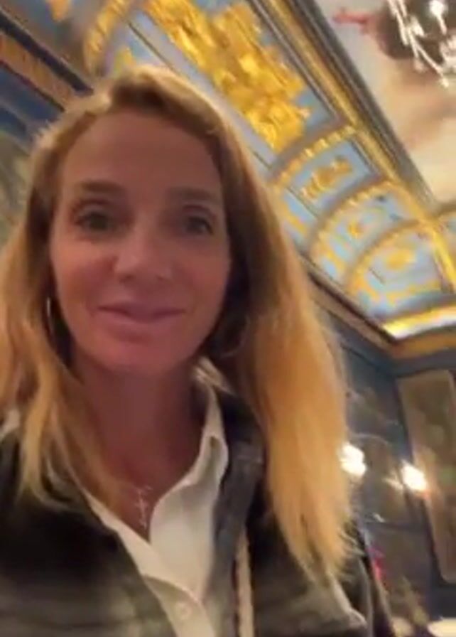 A woman with long, reddish-blonde hair faces the camera and looks directly at the viewer. She is wearing a white shirt under a gray and black plaid jacket. She smiles slightly. She is wearing hoop earrings and a necklace with a small cross pendant. The camera moves slightly to the side to reveal a high-end, ornate room behind her. The walls are paneled in blue and gold, and there are large paintings on the walls. There are several tables and chairs arranged in the room, suggesting it is a lounge or waiting area. The ceiling is decorated with intricate gold and blue designs. The overall impression is one of luxury and elegance.
