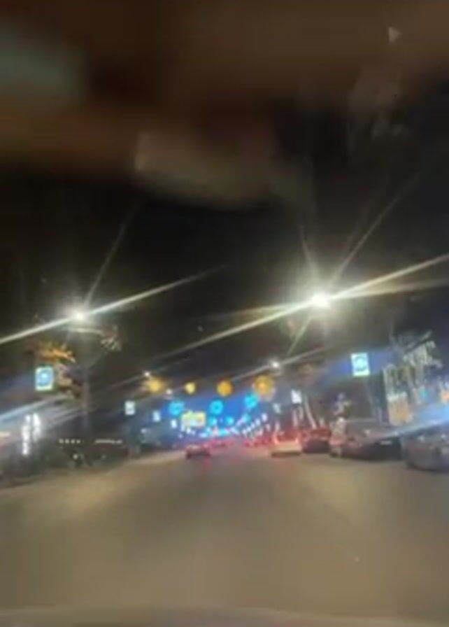 view from inside a car driving down a street at night. There are streetlights decorated with colorful holiday lights above the road. Other cars are visible on the road. The street is lined with businesses.