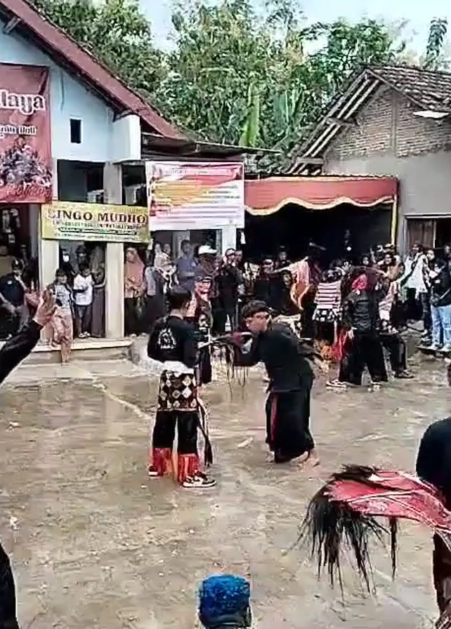 The video depicts a traditional Indonesian dance performance taking place outdoors in a courtyard or open space. Several performers dressed in black costumes, some wearing decorative masks and carrying objects resembling horse tails, are actively engaged in the dance. The performers move dynamically, interacting with each other in a choreographed manner. A small crowd of spectators, including adults and children, are gathered around the periphery of the courtyard, observing the performance. Banners with Indonesian script and illustrations are displayed on nearby buildings. The setting appears to be a rural village, with traditional Indonesian-style houses visible in the background. The overall atmosphere is that of a cultural event or celebration.