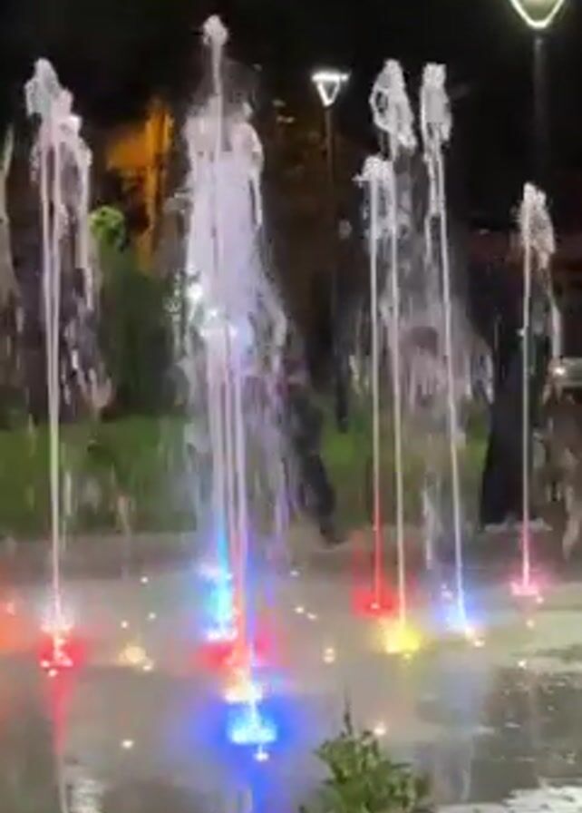 water fountain at night. The fountain has multiple water jets that shoot straight up, lit with changing colorful lights. The surrounding area appears to be a park with streetlights and green vegetation. People are walking around in the background.