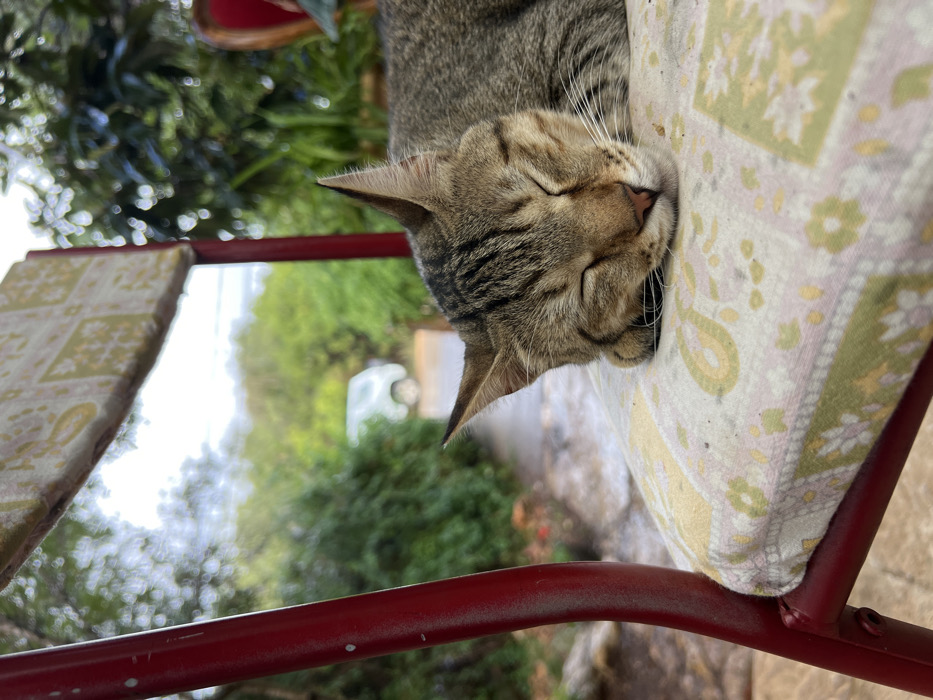 - "A brown and black striped tabby cat is observed sleeping on a padded chair cushion" by FM-8yKDv2, licensed under CC BY 4.0