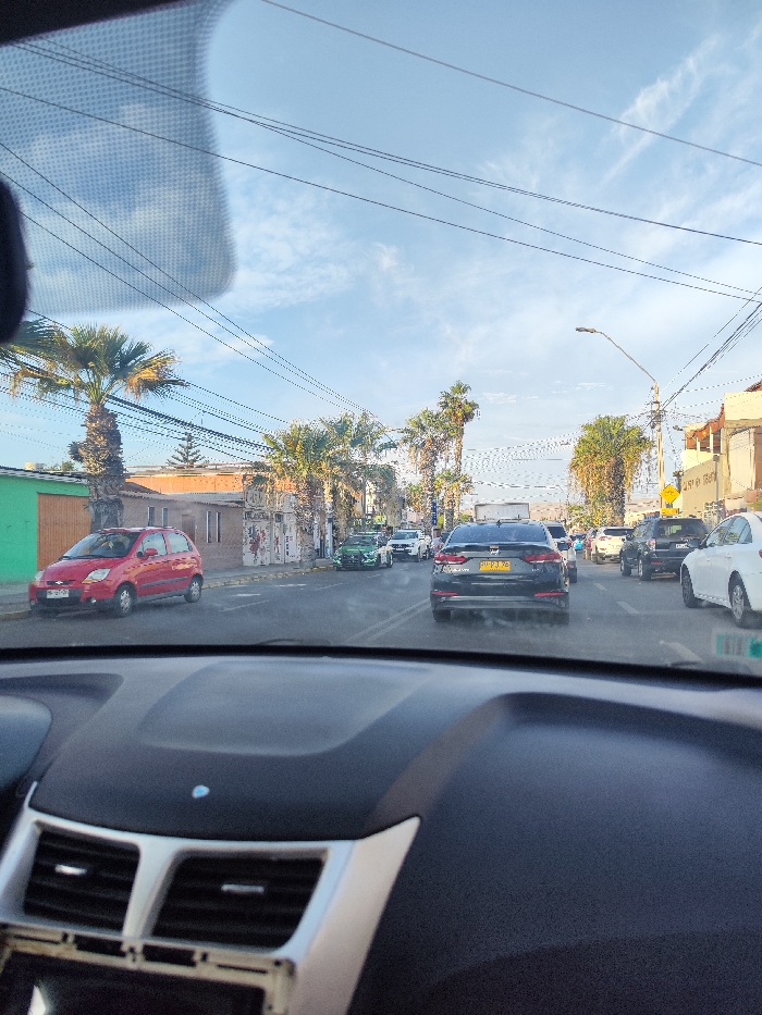 A street view from inside a car. Several parked cars are along the roadside, and other cars are driving on the street. Palm trees are on both sides of the street. The sky is visible and clear with few clouds. The dashboard of the car is visible.