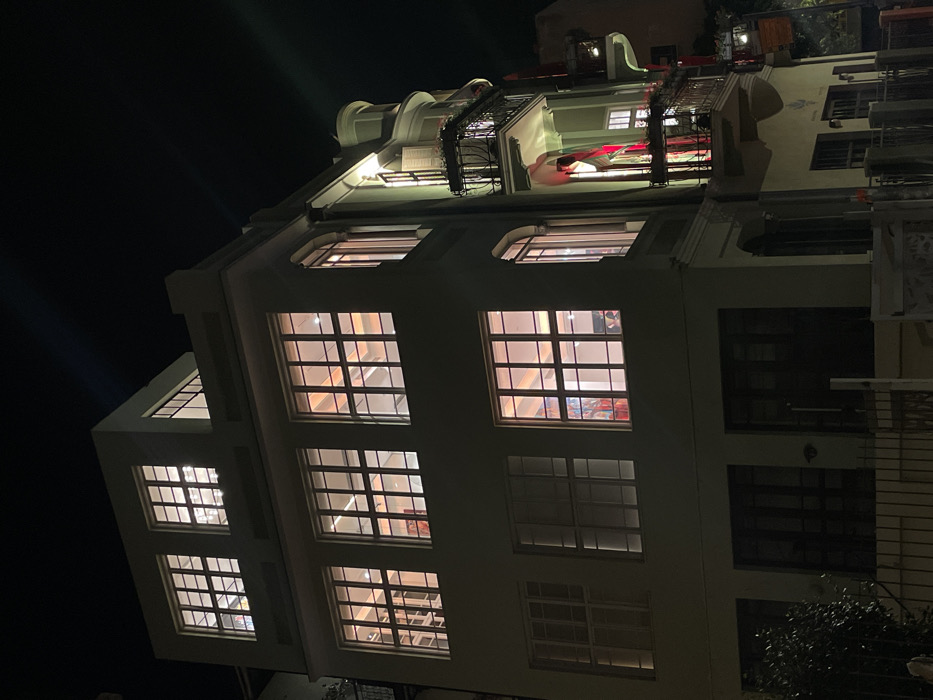 An image captured at night depicts the Braverman Gallery building, located at Rothschild Boulevard 76 in Tel Aviv, Israel. The four-story, light-colored Bauhaus-style building features prominent grid-pattern windows and a distinctive curved corner with multiple balconies adorned with planters. Interior lighting illuminates the windows, revealing artwork and what appears to be an art exhibition space within. Specific details include brightly colored paintings visible through the windows on the second and third floors. External light fixtures cast light upon the curved facade and balconies. The surrounding environment is dark, indicating nighttime, with minimal background details visible except for some dark foliage in the lower left foreground. No individuals are discernible in the frame, and no overt actions or interactions are taking place.