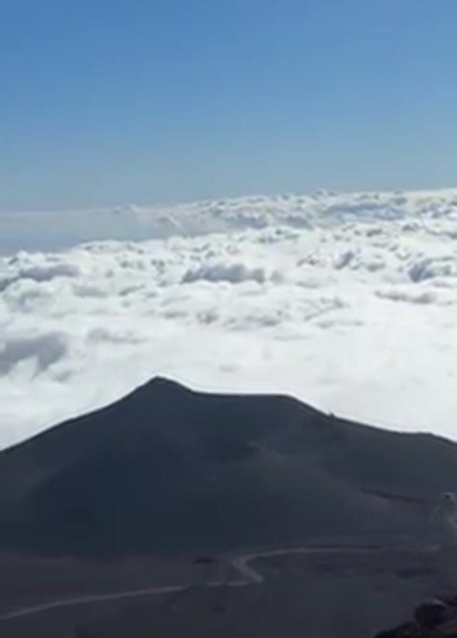 view of a dark, volcanic landscape with a caldera in the foreground. A road winds through the dark terrain. Above the volcanic landscape, a layer of white clouds stretches out to the horizon, topped by a clear blue sky. The camera pans slightly to the left.