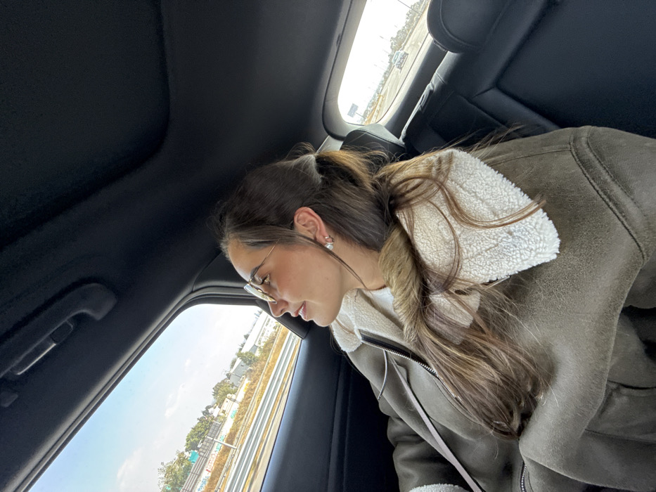 In an angled view from inside a car, a woman with brown hair loosely tied back wears glasses and a brown jacket with a fluffy white lining. She looks out the window at a road with buildings and greenery in the distance under a bright sky. The car's interior includes a dark ceiling, a headrest, and part of the door, adding context to the scene.