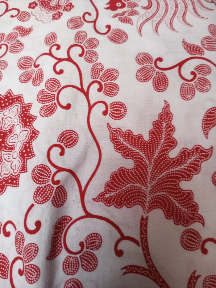 - "The image showcases a white fabric adorned with a red batik pattern" by FM-WQFBv2, licensed under CC BY 4.0