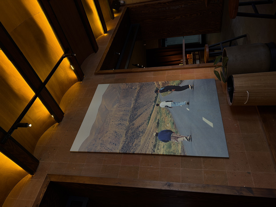 This image displays the interior of a commercial establishment in Yerevan, Armenia. The walls are constructed from reddish-brown, rectangular masonry tiles. The ceiling features a series of arched, light-colored panels intersected by dark wooden beams, illuminated by warm orange-yellow indirect lighting and several black track spotlights. A large, vertical photographic print occupies the central wall, depicting three male figures skateboarding on an asphalt road that recedes into a background of arid, mountainous terrain under a light sky. The road in the print has a faded white broken centerline. The leftmost skater wears a blue jacket and tan pants, the middle skater wears a white t-shirt, light blue jeans, and elbow pads, and the rightmost skater wears a dark long-sleeved shirt and dark pants. To the left, a dark wooden door frame is visible. To the right, an open archway leads into an adjacent space featuring a dark wooden bar counter, two dark stools, and a wooden wall with faint vertical text partially visible, appearing to read "brew coffee a new chapter". In the lower right foreground, a light-colored, vertically slatted cylindrical container and a darker, solid cylindrical planter holding a small green plant are positioned on the floor.