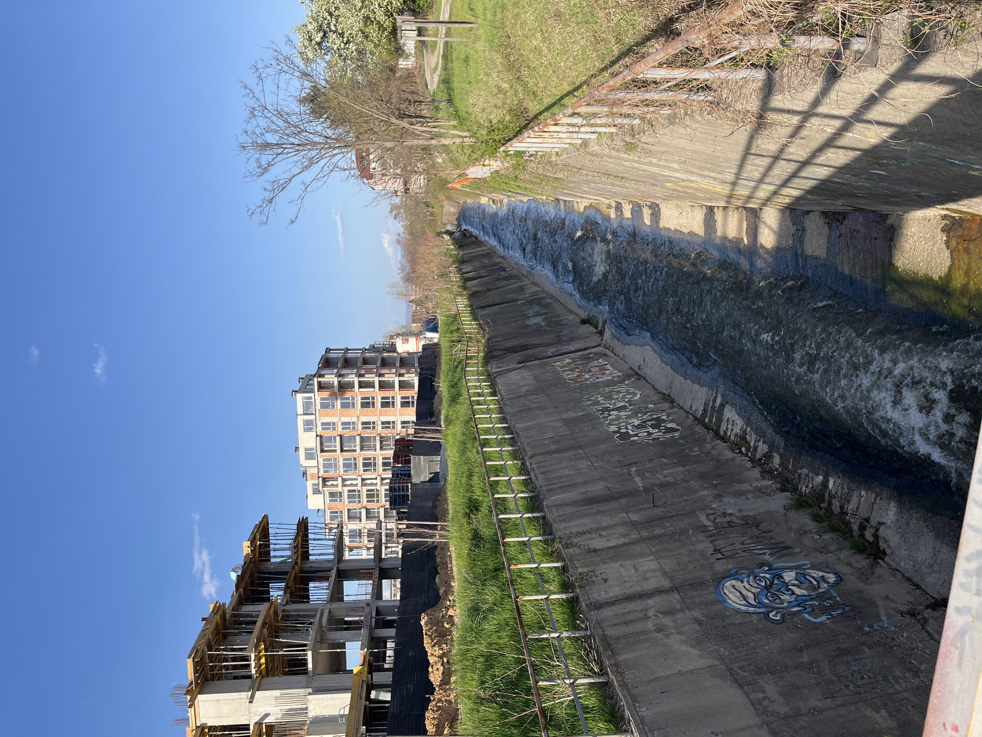 concrete canal carrying water, with graffiti on the canal walls. Adjacent to the canal is a grassy area and a metal barrier. In the background, buildings are under construction and completed apartment buildings are visible. The photograph was likely taken in Sofia, Bulgaria.