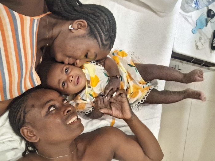 Three Black women are lying together on a white surface. A baby in a yellow and white dress is in the center. An older woman with braids kisses the baby's head. Another woman is next to the baby, smiling up at them. The women appear to be in a comfortable setting. A few items, including a water bottle and comb, are visible in the background.