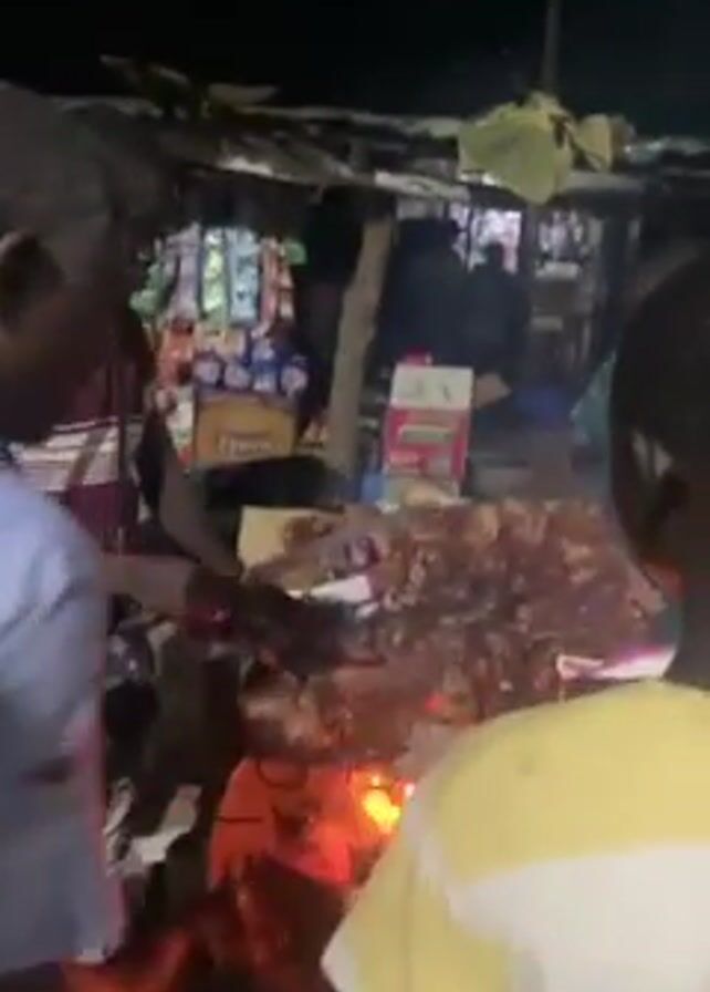 A group of people are gathered around a grill that is cooking what appears to be meat. A few people stand by the grill, seemingly waiting for their order. The grill is set up outdoors at night near a kiosk where snacks and other items are available for sale. One person in a light blue shirt seems to be taking care of the meat, while others are observing.